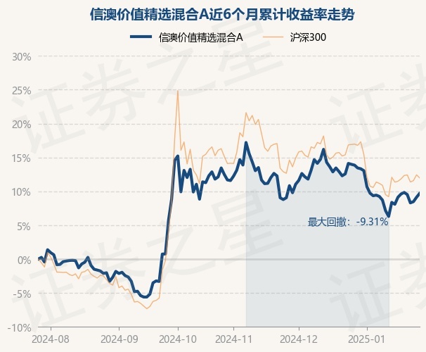 本站消息,1月27日,信澳价值精选混合A最新单位净值为0.7389元,累计净值为0.7389元,较前一交易日上涨0.52%。历史数据显示该基金近1个月下跌3.31%,近3个月下跌2.17%,近6个月上涨9.69%,近1年上涨10.07%。该基金近6个月的累计收益率走势如下图: